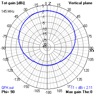 Come si può notare, i diagrammi di irradiazione sono quasi emisferici: la variazione di guadagno in funzione dell'azimuth é minima, mentre in elevazione il lobo a -3dB é ampio più di 120°. Il guadagno di picco (sulla verticale) é intorno a 2dB, mentre il VSWR è inferiore a 2:1 tra 140 e 153 MHz circa.